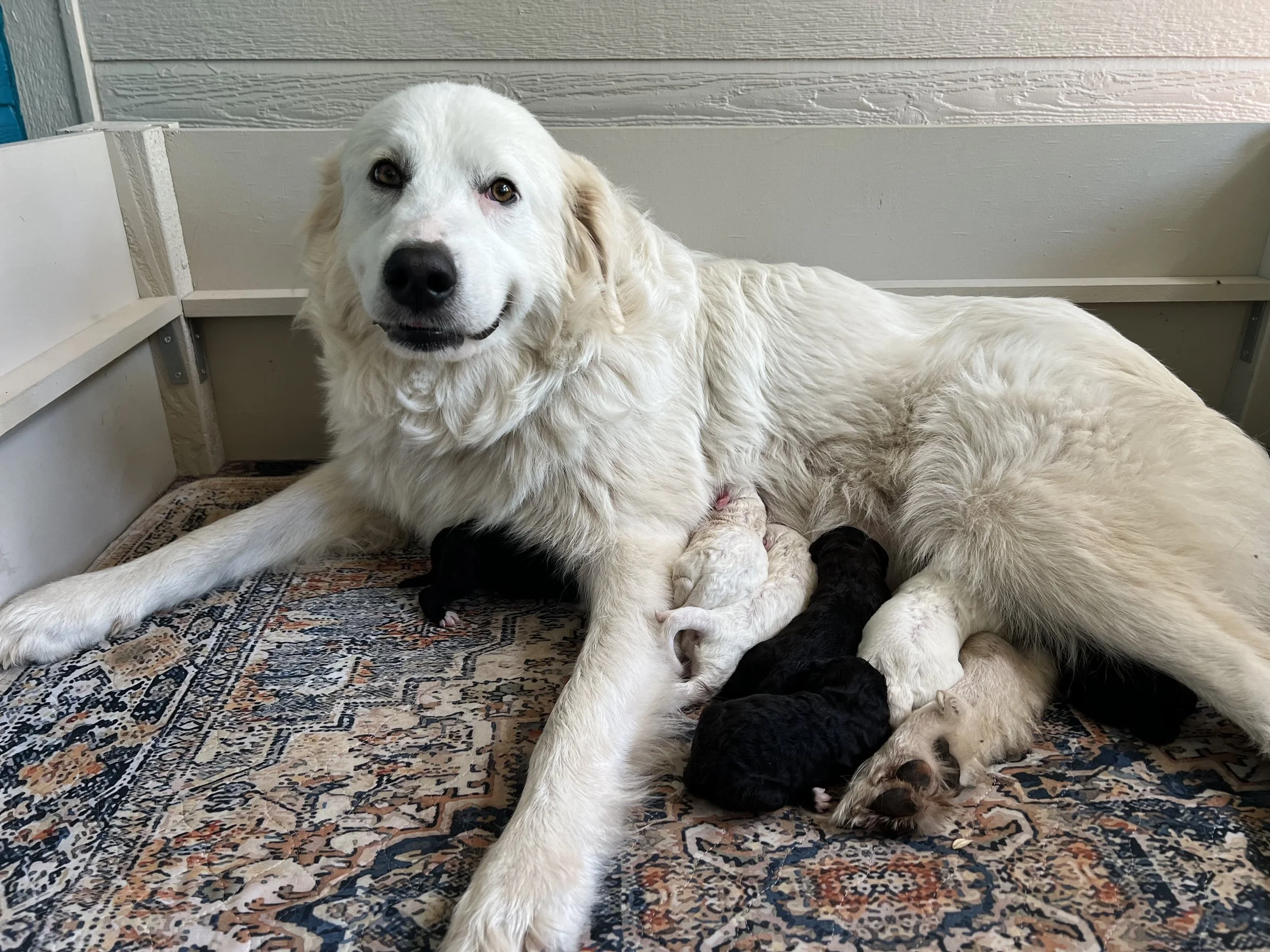 Clover: Our Great Pyrenees mama, a member of our family since July 2021. Clover is a mellow, affectionate, and loyal companion and a wonderful mother to her puppies. She’s the sidekick to our fourteen year old son!